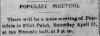 Post- Mirror April 3, 1896 Pg 6 Newspaper page from the Post-Mirror in Pilot Point, Texas. It announces that there will be a mass meeting of Populists in Pilot Point next Saturday, April 11, 1896 at the Masonic hall.