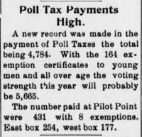 Post-Signal February 2, 1912 Page 5 Newspaper clipping from the Post-Signal in Pilot Point, Texas. It discusses the number of poll taxes paid in Denton County and Pilot Point. -