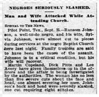 "Negroes Seriously Slashed" (1905) An African American couple received multiple stab wounds while attending a service at a Baptist church in Pilot Point.