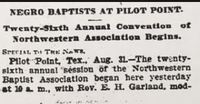 "Negro Baptists at Pilot Point" (1900) Twenty-sixth Annual Convention of the Northwestern Association Baptist meets in Pilot Point. The meeting is attended by African American baptist from the North Texas region.