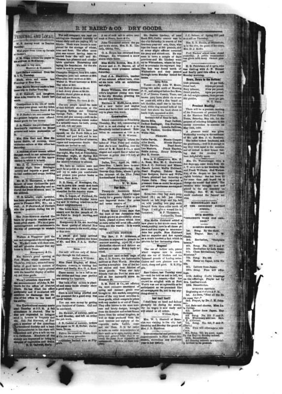 Cadwell, H. D. & Moffitt, D. J. The Post-Mirror. (Pilot Point, Tex.), Vol. 1, No. 12, Ed. 1 Saturday, April 28, 1888,newspaper, April 28, 1888; Pilot Point, Texas. (texashistory.unt.edu/ark:/67531/metapth982801/: accessed April 10, 2018),University of North Texas Libraries, The Portal to Texas History, texashistory.unt.edu; .