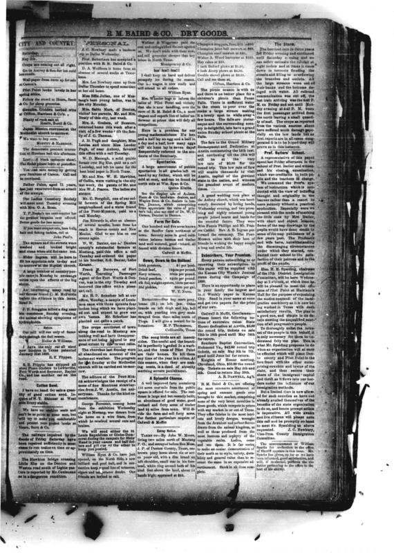 Cadwell, H. D. & Moffitt, D. J. The Post-Mirror. (Pilot Point, Tex.), Vol. 1, No. 13, Ed. 1 Saturday, May 5, 1888, newspaper, May 5, 1888; Pilot Point, Texas. (texashistory.unt.edu/ark:/67531/metapth982624/: accessed April 10, 2018),University of North Texas Libraries, The Portal to Texas History, texashistory.unt.edu; .