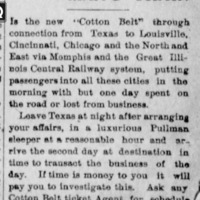 Ad from the Post-Mirror in Pilot Point, Texas. It advertises a new train route called the “Cotton Belt” that connects from Texas and Louisville, Cincinnati, Chicago, and the North and the East via Memphis and the Great Illinois Railway System.