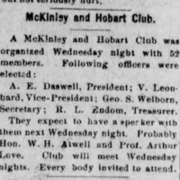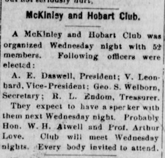 Newspaper page from the Post-Mirror in Pilot Point, Texas. It includes the creation of a club in favor of Presidential and Vice Presidential Candidates McKinley and Hobart with 52 registered members in Pilot Point, Texas.