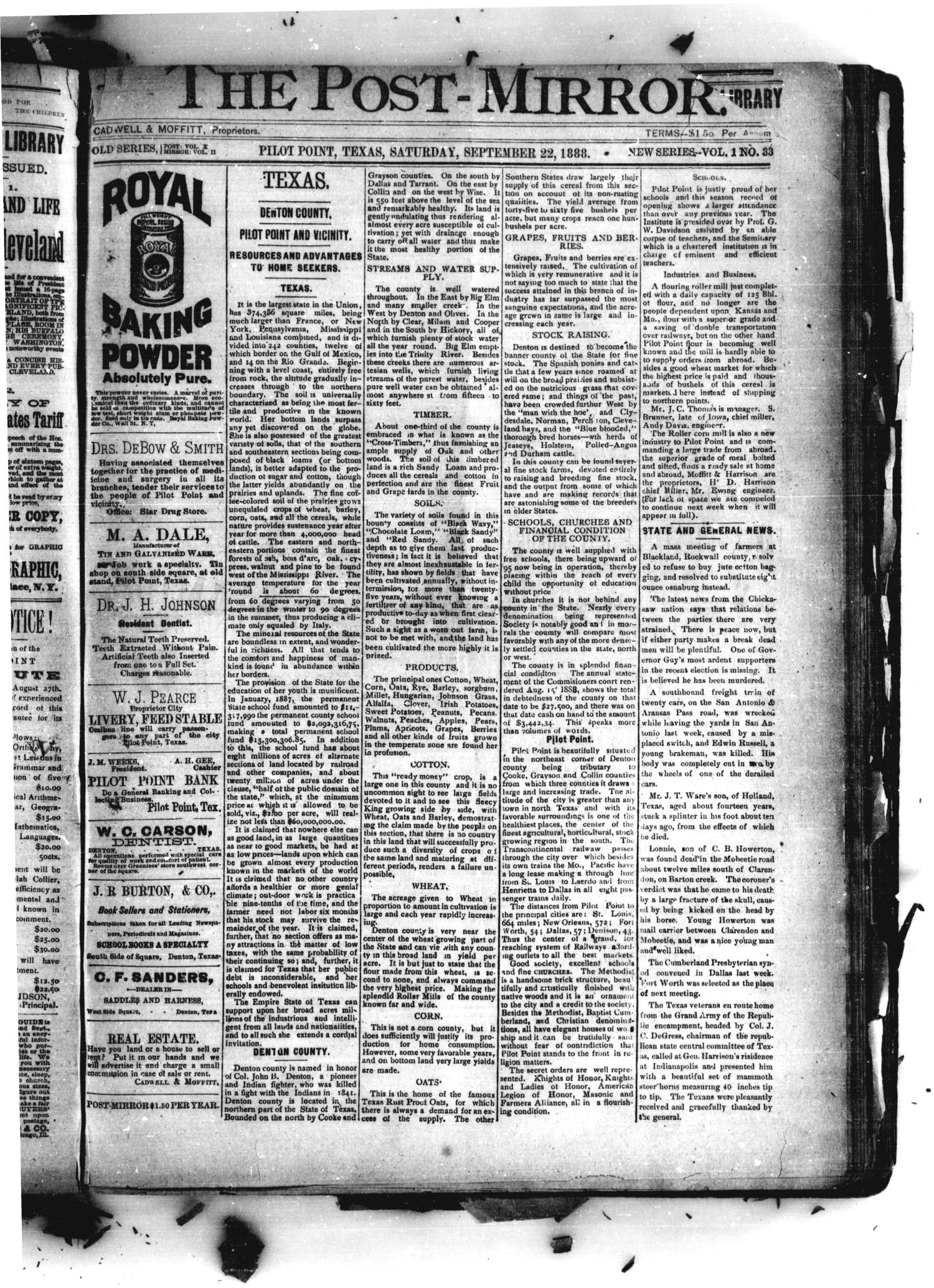 Cadwell, H. D. & Moffitt, D. J. The Post-Mirror. (Pilot Point, Tex.), Vol. 1, No. 33, Ed. 1 Saturday, September 22, 1888,newspaper, September 22, 1888; Pilot Point, Texas. (texashistory.unt.edu/ark:/67531/metapth982706/: accessed April 12, 2018),University of North Texas Libraries, The Portal to Texas History, texashistory.unt.edu; .