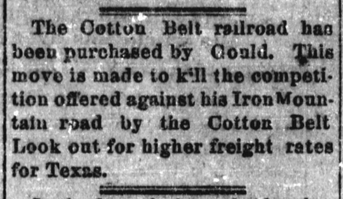 Newspaper clipping from the Post-Mirror in Pilot Point, Texas. It contains an article discussing the purchase of the Cotton Belt Railroad by Jay Gould and the impact that it would have on freight rates and as a result Texas farmers.