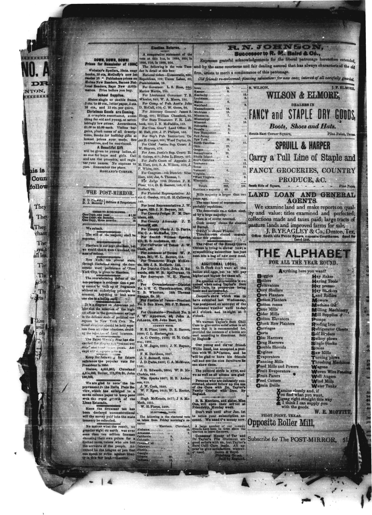Cadwell, H. D. & Moffitt, D. J. The Post-Mirror. (Pilot Point, Tex.), Vol. 1, No. 39, Ed. 1 Saturday, November 10, 1888,newspaper, November 10, 1888; Pilot Point, Texas. (texashistory.unt.edu/ark:/67531/metapth982837/: accessed April 12, 2018),University of North Texas Libraries, The Portal to Texas History, texashistory.unt.edu; .