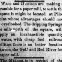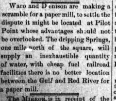 Newspaper clipping from The Mirror in Pilot Point, Texas. It discusses how Pilot Point may be the location for a new paper mill -- Waco and Denton were bidding for it but Pilot Point may be chosen as a compromise. Pilot Point would serve as a good location for the paper mill due to the spring and access to the railroad.