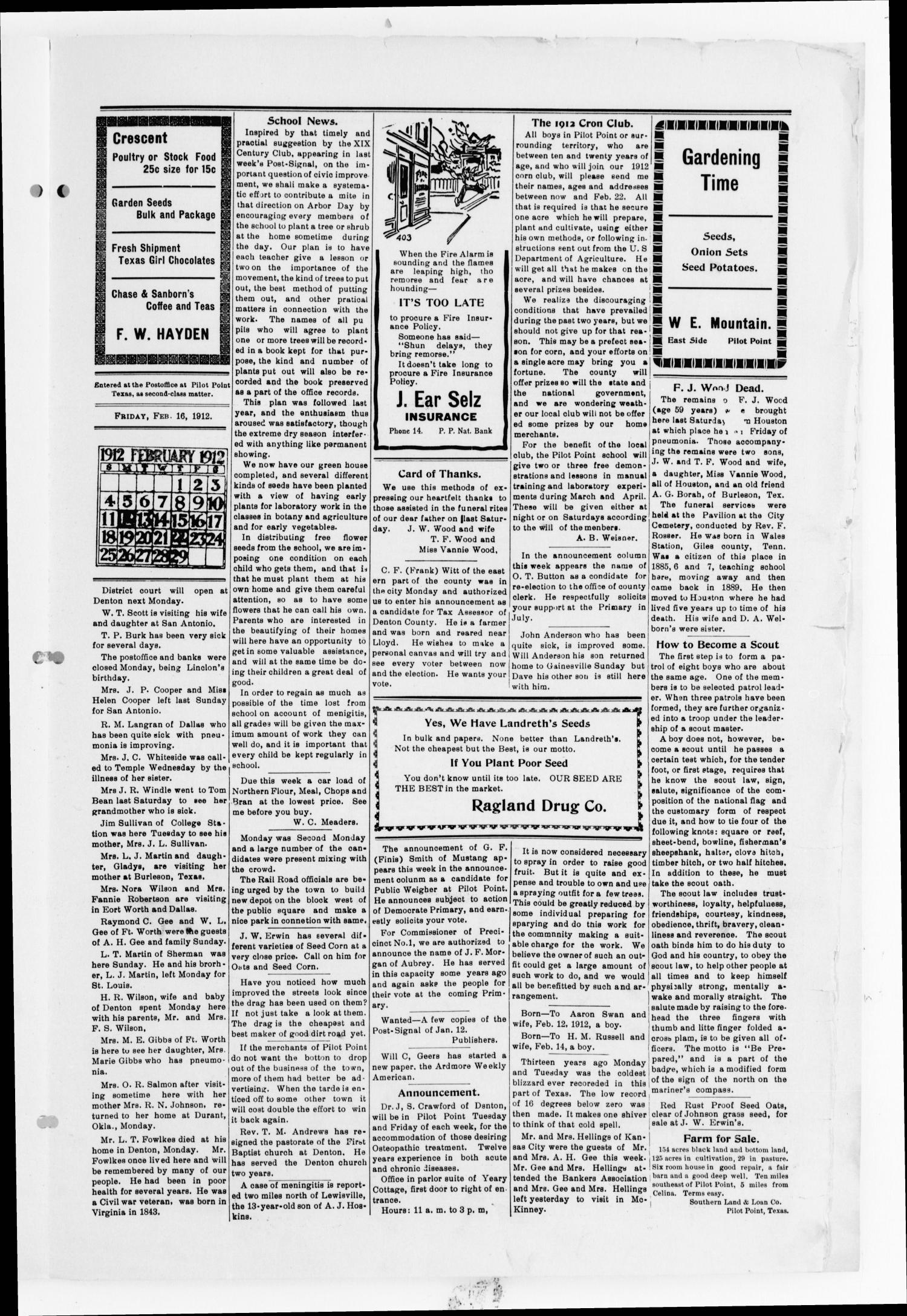 The Post-Signal (Pilot Point, Tex.), Vol. 34, No. 25, Ed. 1 Friday, February 16, 1912,newspaper, February 16, 1912; Pilot Point, Texas. (texashistory.unt.edu/ark:/67531/metapth291204/: accessed April 14, 2018),University of North Texas Libraries, The Portal to Texas History, texashistory.unt.edu; crediting Denton Public Library.