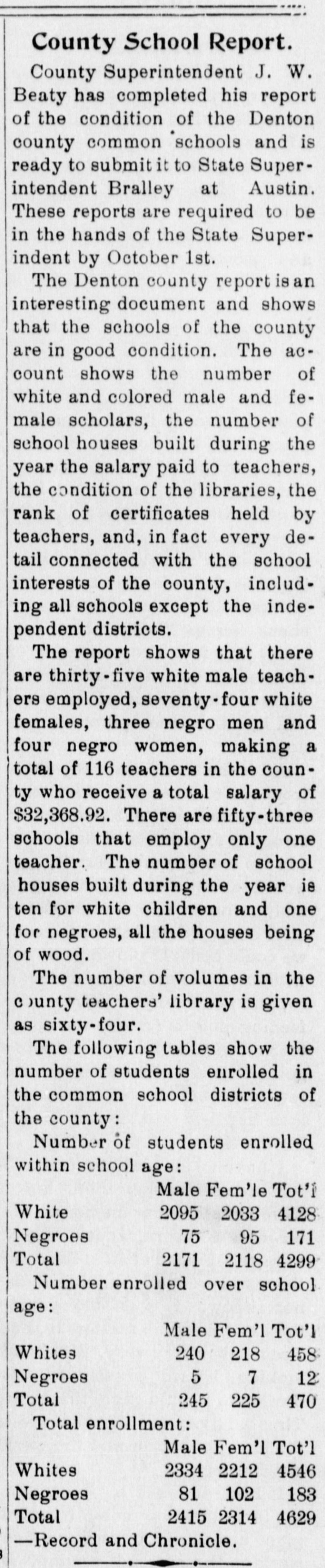1910 Denton County School Report from the Post-Signal describing the number of students of each race in Denton County.