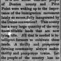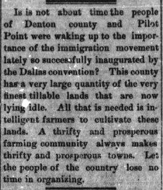 Newspaper clipping from The Mirror in Pilot Point, Texas. It discusses how Denton county and Pilot Point should support the immigration movement. It claims that the good land in the area just needs farmers which would lead to prosperity and thriving towns.
