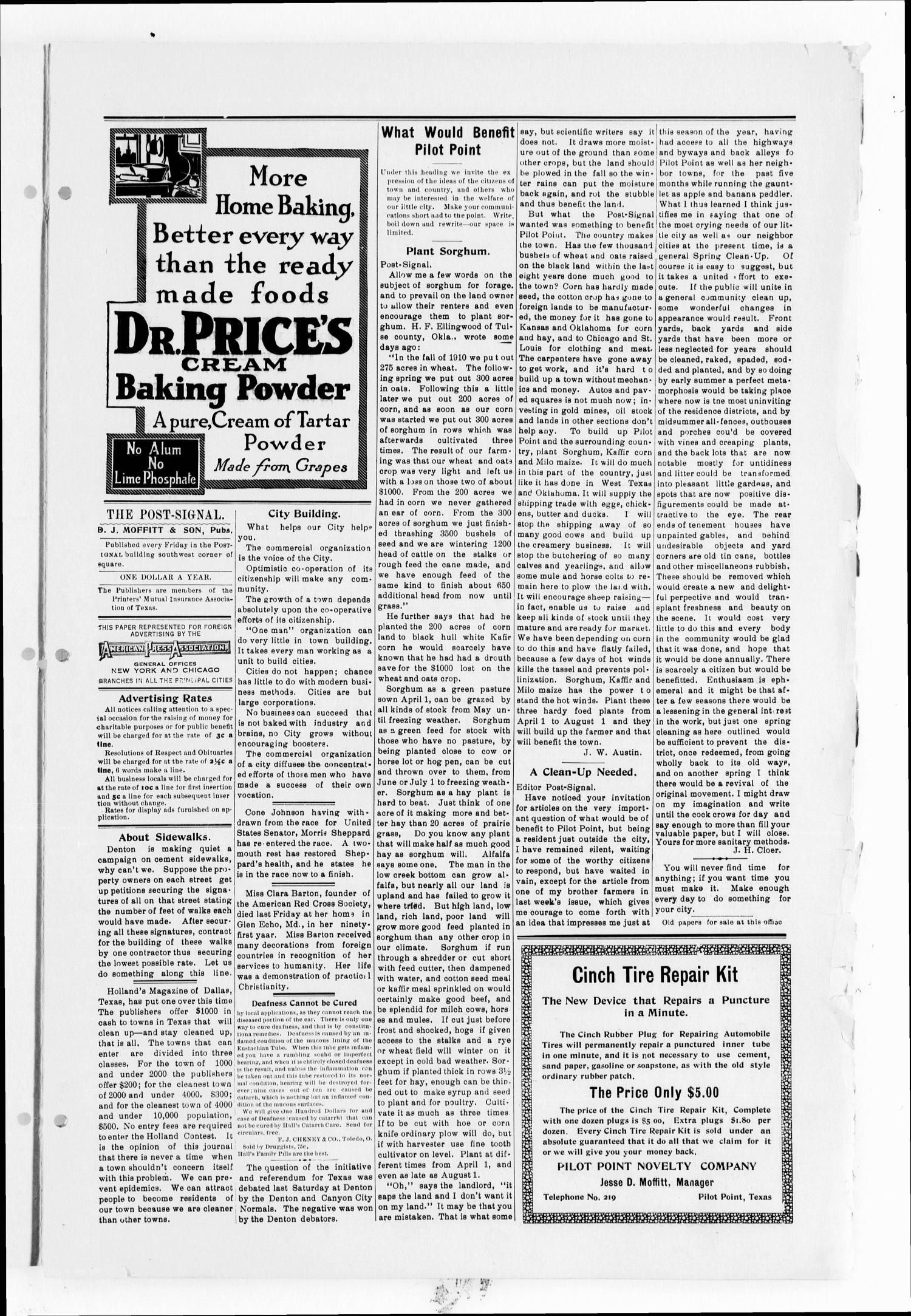 The Post-Signal (Pilot Point, Tex.), Vol. 34, No. 34, Ed. 1 Friday, April 19, 1912,newspaper, April 19, 1912; Pilot Point, Texas. (texashistory.unt.edu/ark:/67531/metapth291213/: accessed April 14, 2018),University of North Texas Libraries, The Portal to Texas History, texashistory.unt.edu; crediting Denton Public Library.