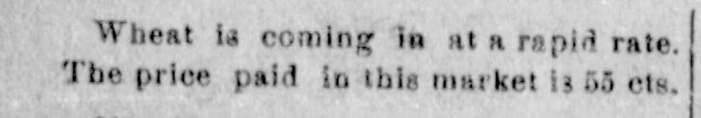 Newspaper page from the Post-Mirror in Pilot Point, Texas. It announces that wheat wis coming in at a steady rate and that the market price for wheat in Pilot Point is advertised at 55 cents.