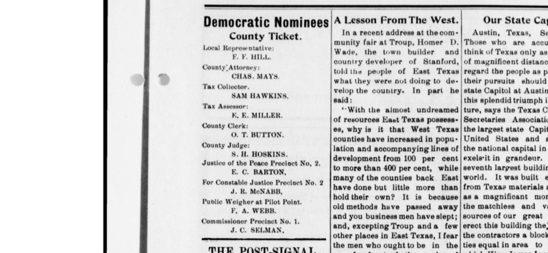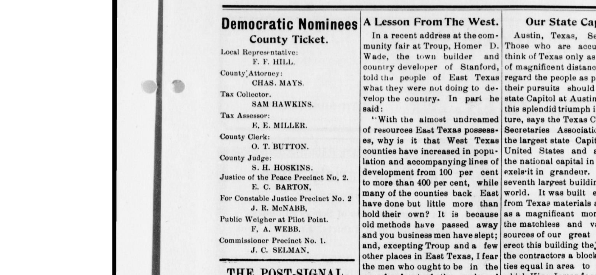 The Post-Signal (Pilot Point, Tex.), Vol. 33, No. 3, Ed. 1 Friday, September 16, 1910, newspaper,September 16, 1910; Pilot Point, Texas. (texashistory.unt.edu/ark:/67531/metapth291134/m1/3/?q=post-signal%201910%20September: accessed April 13, 2018), University of North Texas Libraries, The Portal to Texas History, texashistory.unt.edu.