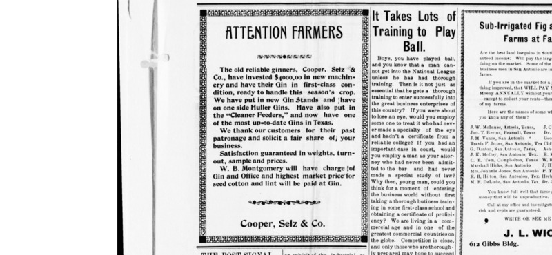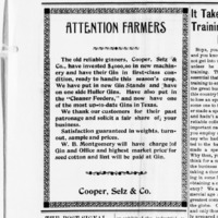 An article in the Post-Signal newspaper of Pilot Point, Texas. The article announces to farmers the investment into new Gin machinery by Cooper, Selz & Co.