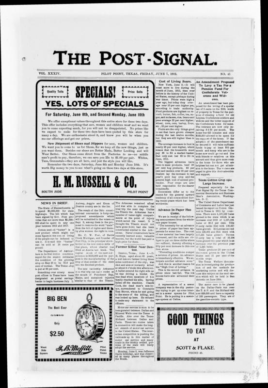 The Post-Signal (Pilot Point, Tex.), Vol. 34, No. 41, Ed. 1 Friday, June 7, 1912,newspaper, June 7, 1912; Pilot Point, Texas. (texashistory.unt.edu/ark:/67531/metapth291220/: accessed April 14, 2018),University of North Texas Libraries, The Portal to Texas History, texashistory.unt.edu; crediting Denton Public Library.