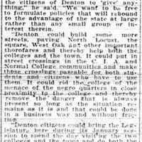 - Newspaper article chronicling an address issued by the president of CIA (now TWU), Dr. F.M. Bralley, who emphasized that the City should remove the African American quarters that were in close proximity to the women's institution. Furthermore, Bralley claimed that Quakertown residents conflicted with Denton's business interests.